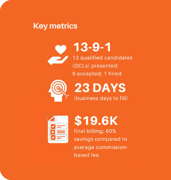 Seeking to leverage its 32-year history and further increase momentum, Helpside partnered with IsoTalent to recruit an in-state VP of Sales. After an efficient workflow integration, IsoTalent quickly presented top-quality executive candidates to match Helpside's work culture, strategy, and growth projections. The process took 23 business days from source to final hire, with final billing coming in just under target price range.